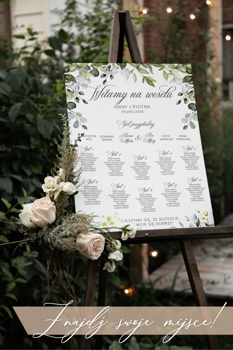 Jeden z elementów złotego trio ułatwiającego organizację na weselu. Zanim goście odszukają odpowiedni numer stołu, a potem naszykowane dla nich nakrycie, oznaczone imienną winietką najpierw odnajdą swoje nazwisko na planie stołów. To pomoże uniknąć niepotrzebnego rozgardiaszu oraz przyśpieszy zlokalizowanie właściwego miejsca. W Artmie znajdziecie plany stołów o wysokiej jakości wydruku, w dwóch rozmiarach i orientacjach: pionowej oraz poziomej. Wybierzcie wzór odpowiadający reszcie dodatków, a zamienicie ten użyteczny element w przepiękną dekorację.