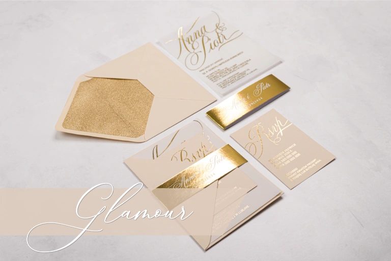Złoto to od zawsze symbol elegancji, szyku oraz bogactwa. Nigdy nie wychodzi z mody, a wręcz przeciwnie zyskuje na popularności. W ostatnim czasie zawładnął również branżą ślubną, co sprawiło, że zaproszenia ze złoceniem są jednymi z najczęściej wybieranych na uroczystości weselne. Wyważone o subtelnym blasku tworzą kompozycje szalenie gustowne. Nie można odmówić im klasy oraz piękna, natomiast pozbawione są przesadnego przepychu. Delikatności dodają subtelne wzory kwiatowe oraz pastelowe kolory, a wytworności dodają im głębokie odcienie zieleni, granatu lub czerwieni. Takie zaproszenia to zapowiedź wesela w wielkim stylu.