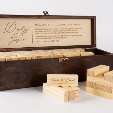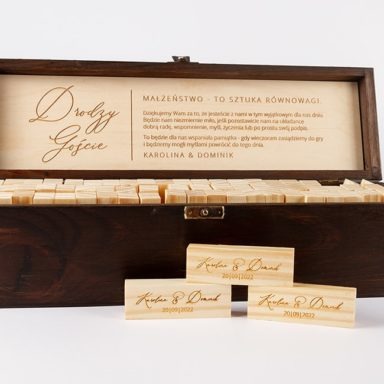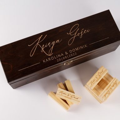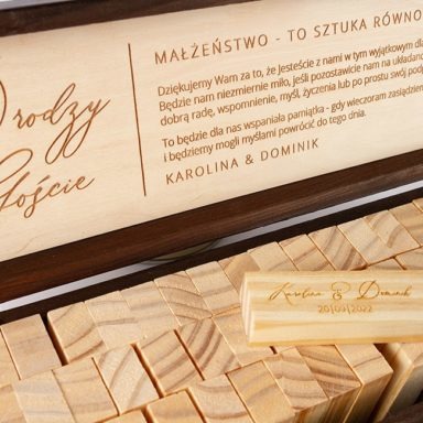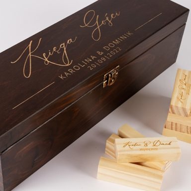 Drewniane szkatułki z grawerowanymi wieczkami które na polskich weselach coraz częściej zastępują tradycyjne księgi gości weselnych. Wewnątrz szkatułek znajdziemy drewniane serduszka lub karteczki do składania życzeń młodej parze.
