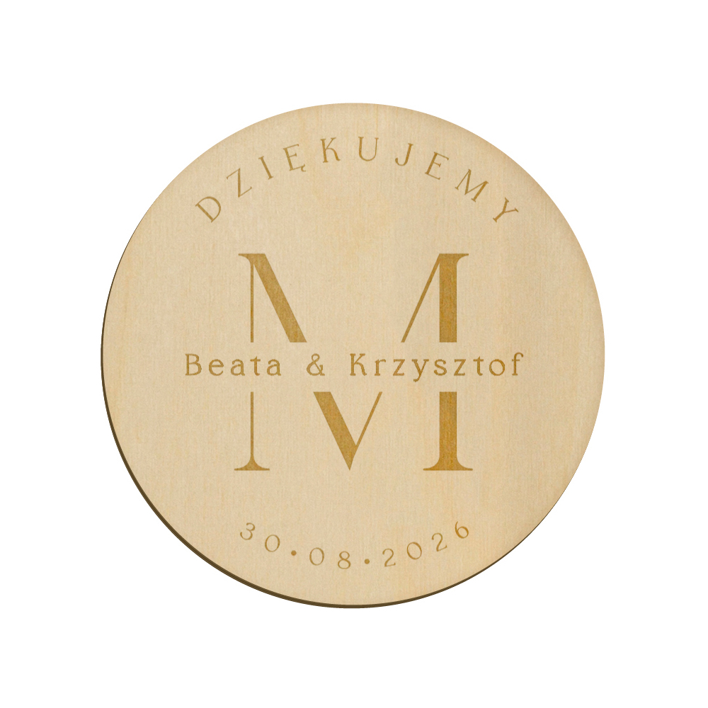 • Magnesy Drewniane: Idealne na wesela w stylu rustykalnym, boho lub eko. Grawerowane laserowo wzory, Wasze imiona i data ślubu na tle naturalnego drewna (np. plastra brzozy) wyglądają niezwykle ciepło i stylowo.