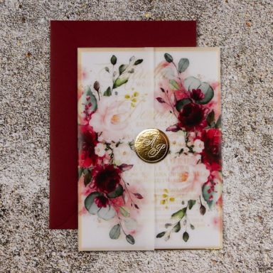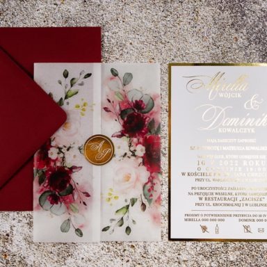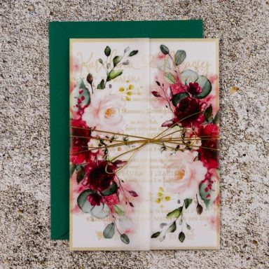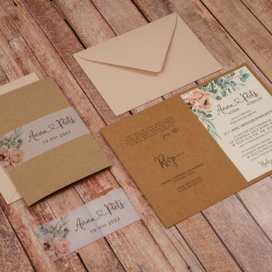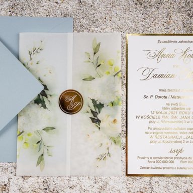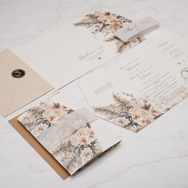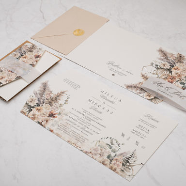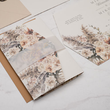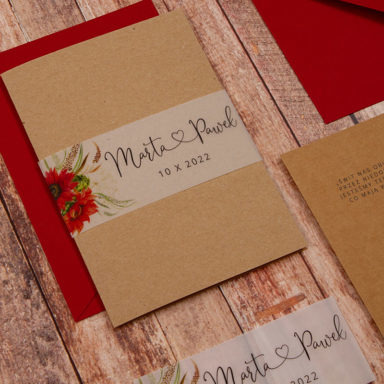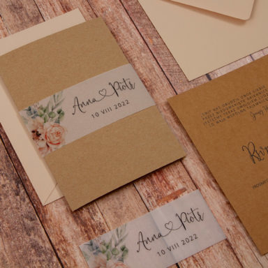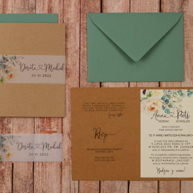 Niezastąpionym dodatkiem, który sprawia, że rustykalne zaproszenia weselne zyskują delikatny, romantyczny charakter są kwiaty. Różnorodne gatunki oraz barwy roślin pozwalają stworzyć projekty w wielu odmiennych odsłonach. Pastelowe odcienie takie jak pudrowe róże, jasne fiolety, szałwiowe zielenie czy błękit pasują do przyjęć w stylu boho, vintage oraz prowansalskim. Tu sprawdzą się delikatne goździki, gipsówka, niezapominajka lub wrzos. Z kolei polne kwiaty będą idealną zapowiedzią uroczystości w klimacie wiejskim i etno. Wyrazista barwa słoneczników, maków oraz chabrów to energetyzująca mieszanka, radośnie zapowiadająca początek waszej wspólnej drogi. Posiadamy także modele zaproszeń, gdzie dominuje jeden gatunek np. eukaliptus, paproć czy bez. Te warianty szczególnie przypadną do gustu parom ceniącym sobie styl minimalistyczny.
