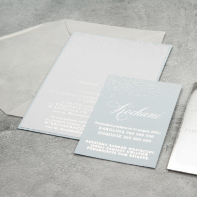 Jedni kochają lato za gorące, upalne dni, inni jesień za przepiękne kolory a jeszcze inni zimę świąteczną aurę i wspaniałe zimowe pejzaże. Jeżeli należycie do tej ostatniej grupy to koniecznie zajrzyjcie do naszej oferty wzorów zaproszeń idealnych na zimowe wesele i ślub. Prezentowane tam modele zachwycają elegancką estetyką oraz oryginalnymi motywami. Ich chłodne barwy przywodzą na myśl mroźny, zimowy dzień, podczas gdy, Wasza historia miłości przelana na papier jest jak ciepły ogień w kominku. Pozwólcie gościom znaleźć się w tej bańce przytulności i podarujcie im te niesamowite zaproszenia weselne. Niech od pierwszej chwili zachwycają swoją magią i będą zapowiedzią radosnego spotkania w gronie najbliższych: rodziców, dziadków oraz przyjaciół.