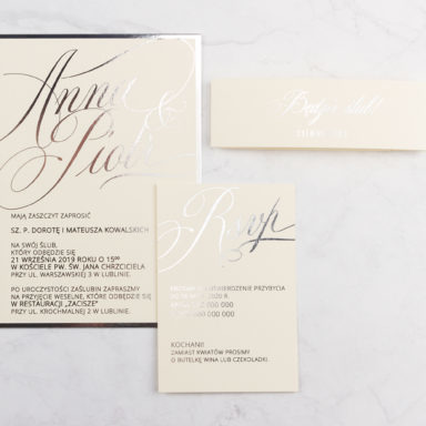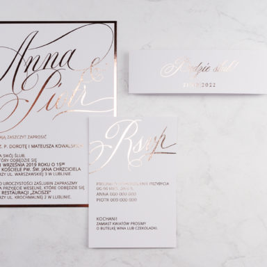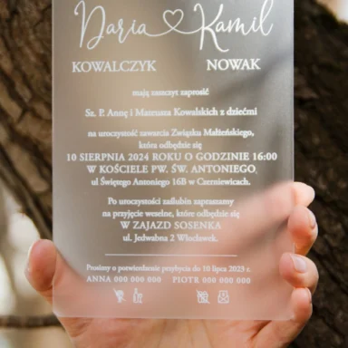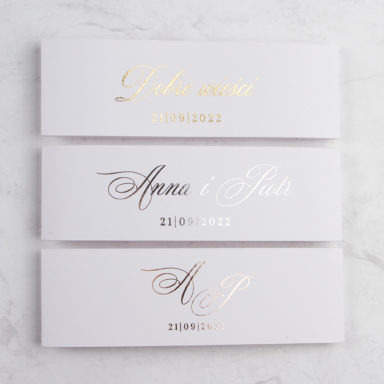 Z naszymi zaproszeniami każdy gość poczuje ciepło Waszej miłości, otoczonej zimowym splendorem. Niezależnie od tego, czy marzycie o skromnym ślubie w śnieżnej scenerii, czy o eleganckiej uroczystości w pałacu, nasze produkty z pewnością wzbudzą zachwyt i podniosą nastrój Waszego wyjątkowego dnia. Niech każde zaproszenie będzie jak ciepły promień w zimowym chłodzie, zapowiadający radosne chwile Waszego ślubu. Bliżej wesela wróćcie do nas po dodatki specjalne skrojone na tę okazję. Wśród nich znajdziecie zawieszki na alkohol, winietki, naklejki, pudełka na ciasto, czy plany stołów.
