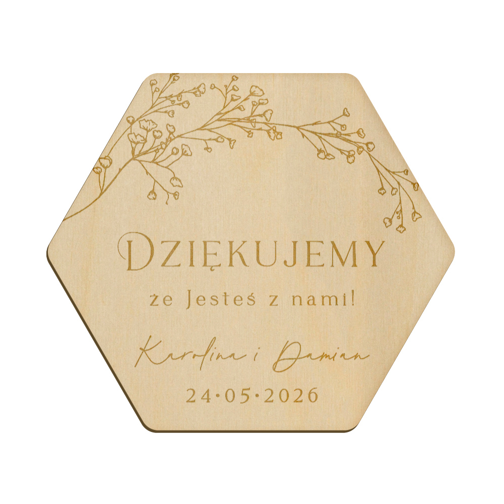 Drewniany magnes z grawerunkiem idealnie sprawdzi się w roli podziękowania dla gości weselnych.