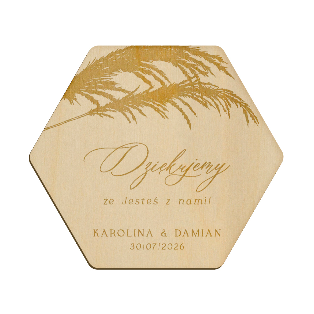 Drewniany magnes z grawerunkiem idealnie sprawdzi się w roli podziękowania dla gości weselnych.