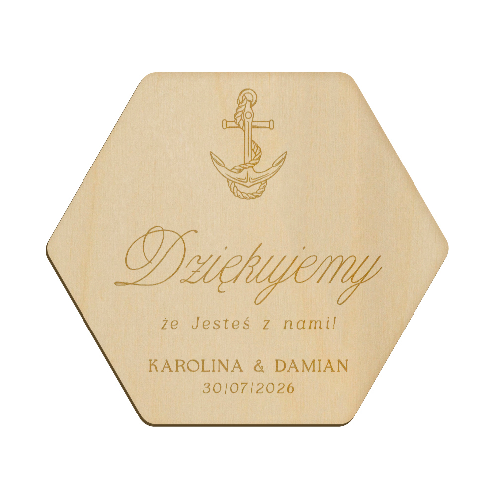 Drewniany magnes z grawerunkiem idealnie sprawdzi się w roli podziękowania dla gości weselnych.