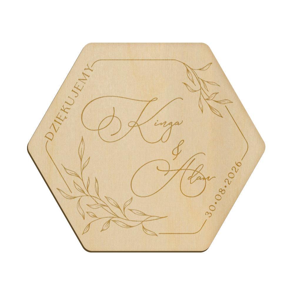 Drewniany magnes z grawerunkiem idealnie sprawdzi się w roli podziękowania dla gości weselnych.