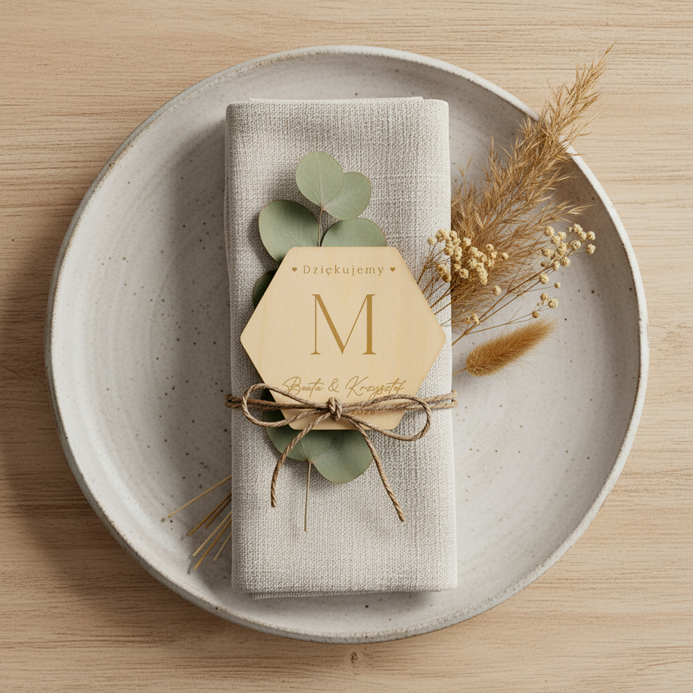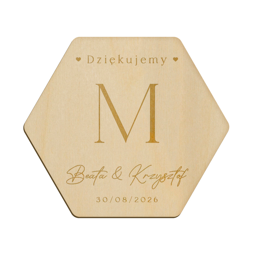 Drewniany magnes z grawerunkiem idealnie sprawdzi się w roli podziękowania dla gości weselnych.