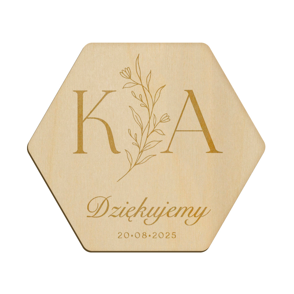 Drewniany magnes z grawerunkiem idealnie sprawdzi się w roli podziękowania dla gości weselnych.