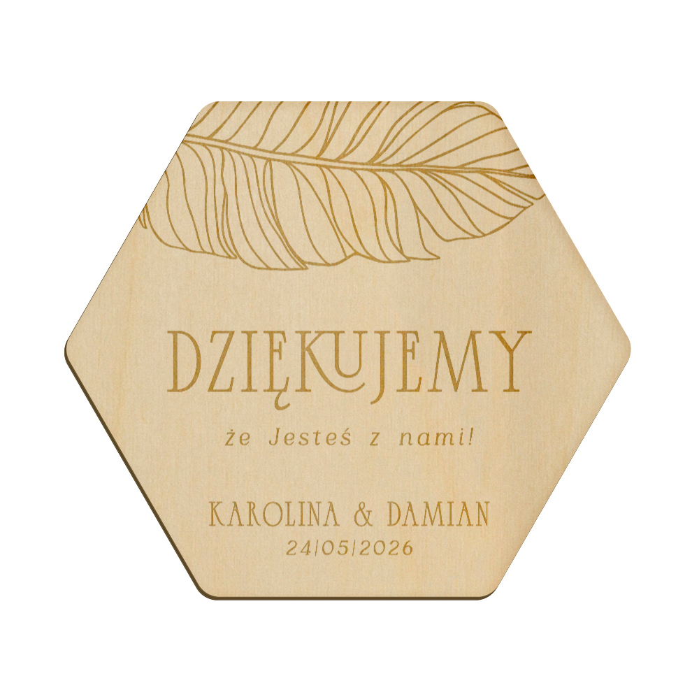Drewniany magnes z grawerunkiem idealnie sprawdzi się w roli podziękowania dla gości weselnych.