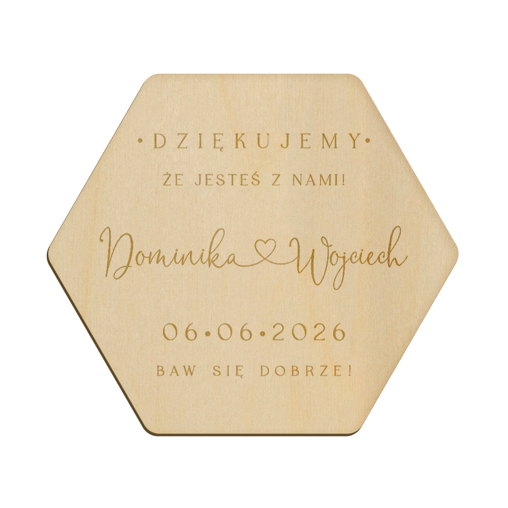 Drewniany magnes z grawerunkiem idealnie sprawdzi się w roli podziękowania dla gości weselnych.