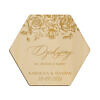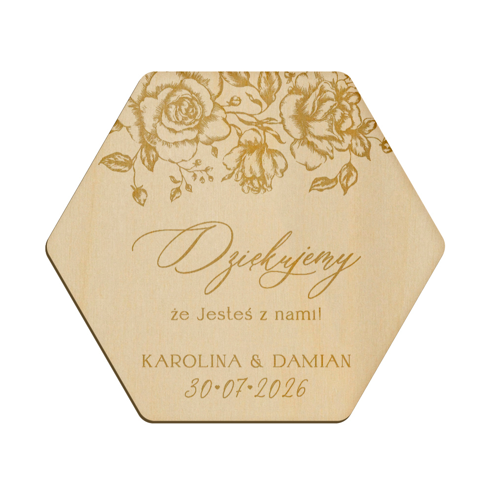 Drewniany magnes z grawerunkiem idealnie sprawdzi się w roli podziękowania dla gości weselnych.