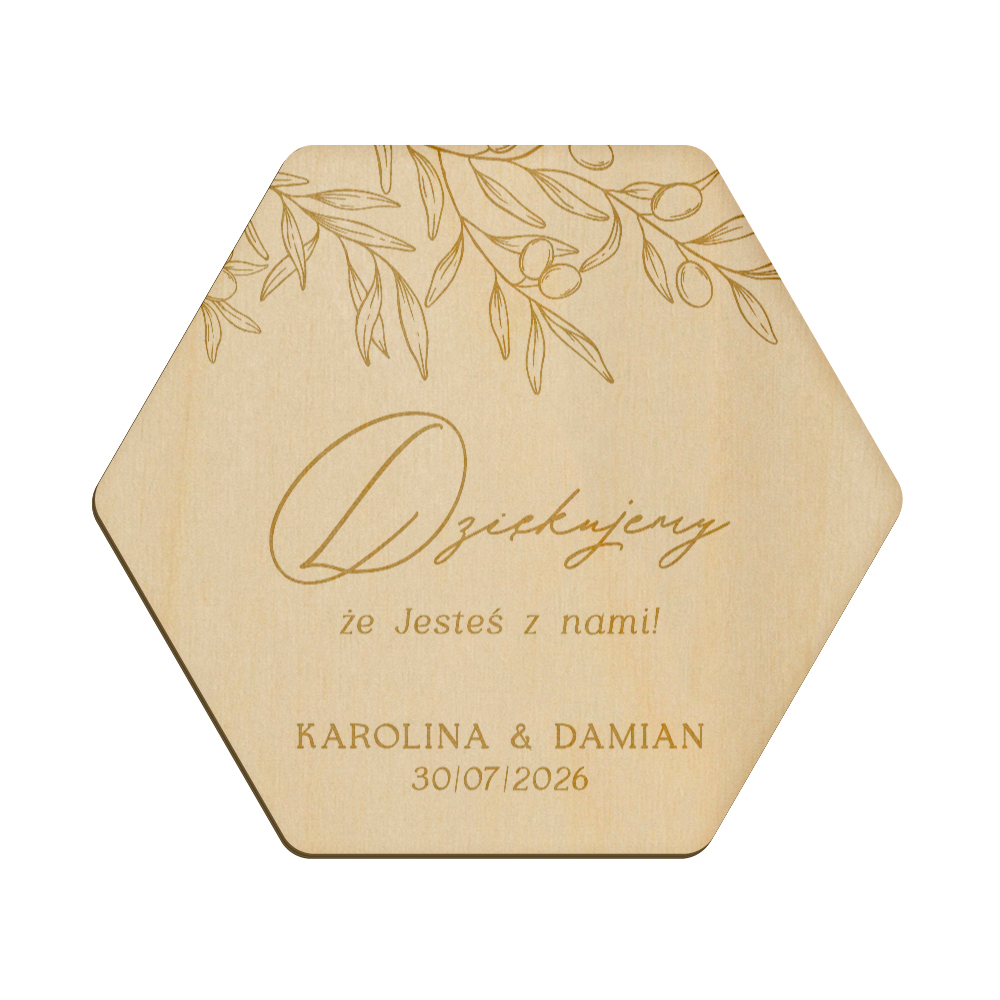 Drewniany magnes z grawerunkiem idealnie sprawdzi się w roli podziękowania dla gości weselnych.