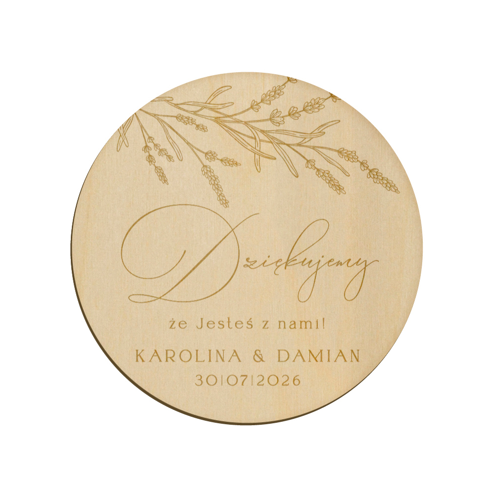 Drewniany magnes z grawerunkiem idealnie sprawdzi się w roli podziękowania dla gości weselnych.