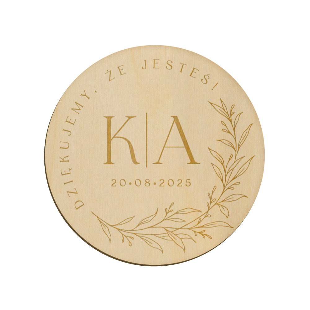 Drewniany magnes z grawerunkiem idealnie sprawdzi się w roli podziękowania dla gości weselnych.