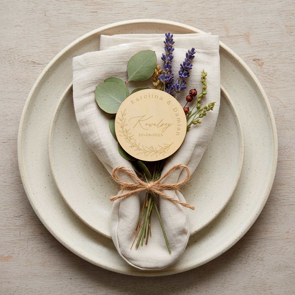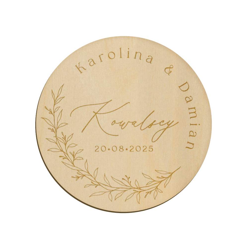 Drewniany magnes z grawerunkiem idealnie sprawdzi się w roli podziękowania dla gości weselnych.