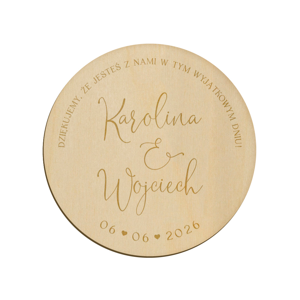 Drewniany magnes z grawerunkiem idealnie sprawdzi się w roli podziękowania dla gości weselnych.