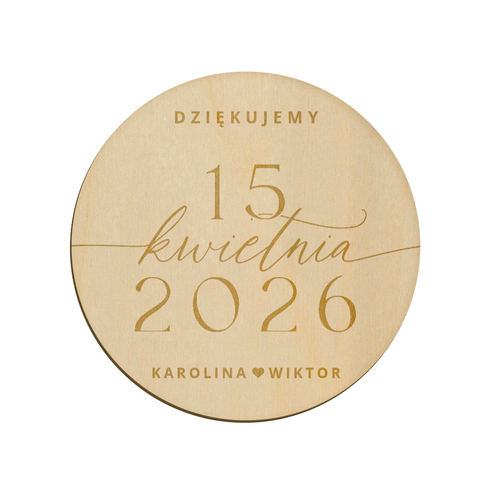 Drewniany magnes z grawerunkiem idealnie sprawdzi się w roli podziękowania dla gości weselnych.
