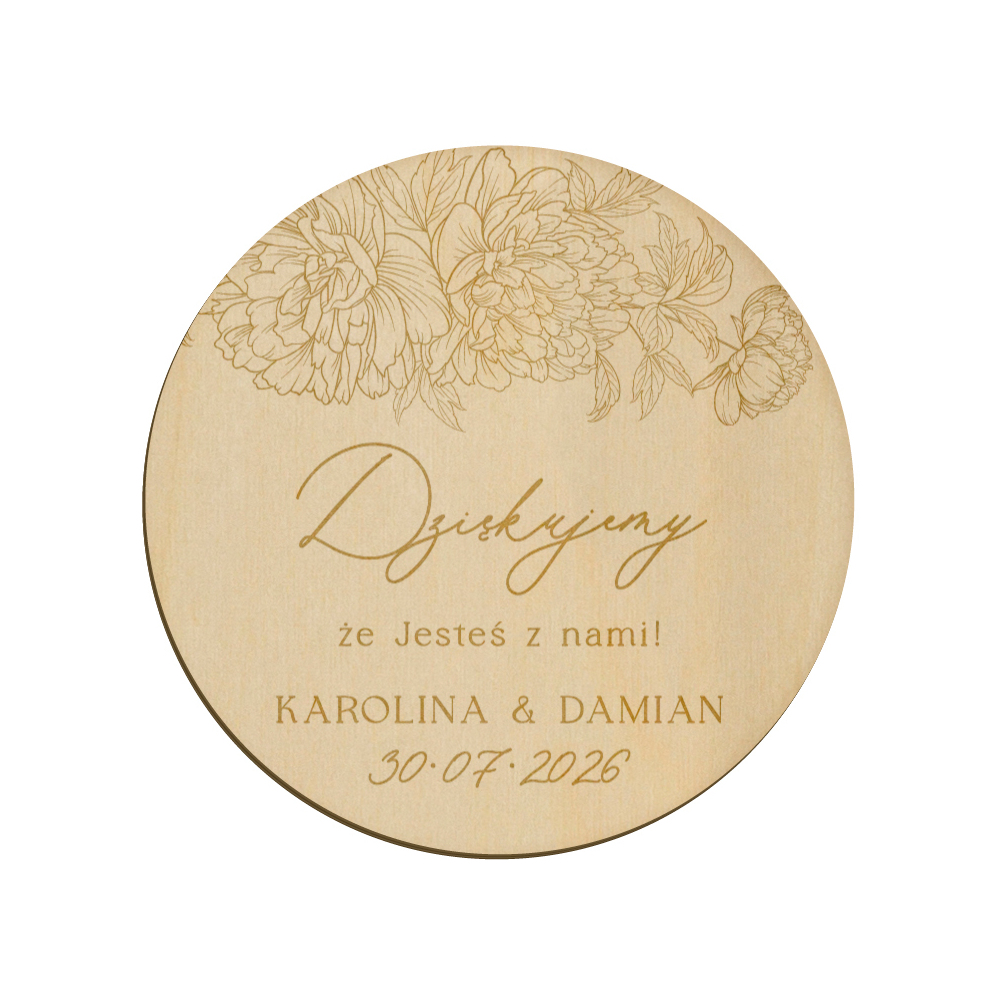 Drewniany magnes z grawerunkiem idealnie sprawdzi się w roli podziękowania dla gości weselnych.