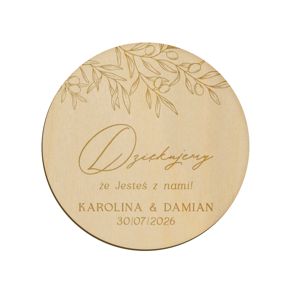 Drewniany magnes z grawerunkiem idealnie sprawdzi się w roli podziękowania dla gości weselnych.