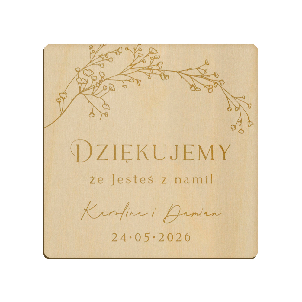 Drewniany magnes z grawerunkiem idealnie sprawdzi się w roli podziękowania dla gości weselnych.