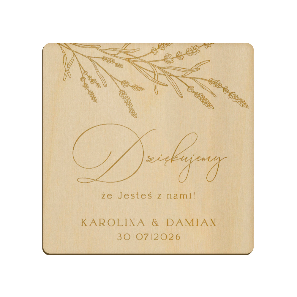 Drewniany magnes z grawerunkiem idealnie sprawdzi się w roli podziękowania dla gości weselnych.