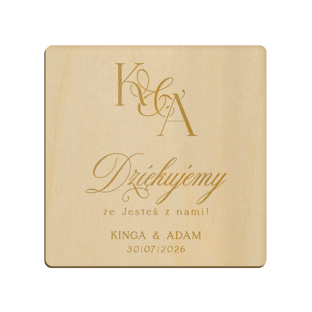 Drewniany magnes z grawerunkiem idealnie sprawdzi się w roli podziękowania dla gości weselnych.