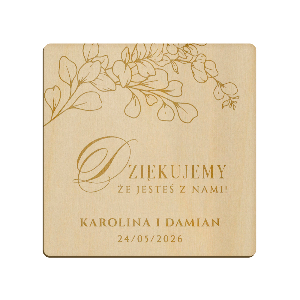 Drewniany magnes z grawerunkiem idealnie sprawdzi się w roli podziękowania dla gości weselnych.