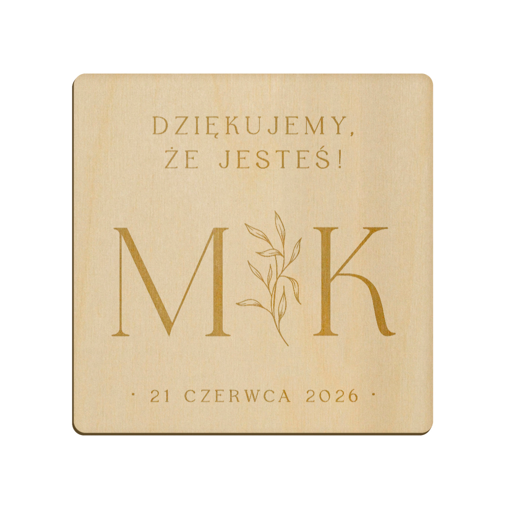 Drewniany magnes z grawerunkiem idealnie sprawdzi się w roli podziękowania dla gości weselnych.