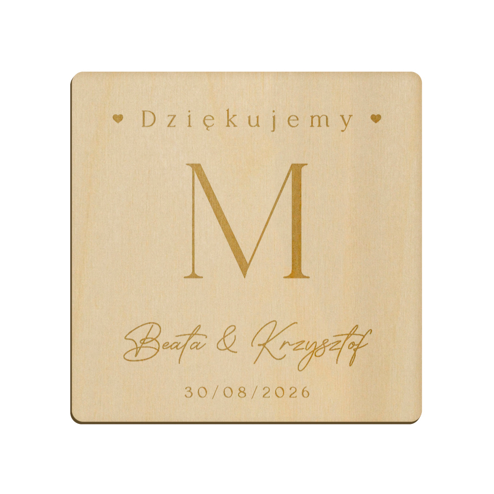 Drewniany magnes z grawerunkiem idealnie sprawdzi się w roli podziękowania dla gości weselnych.