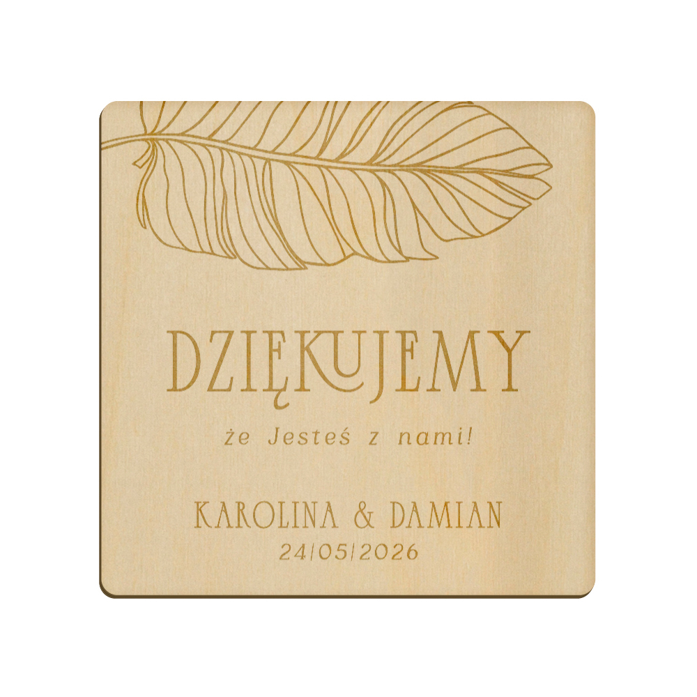 Drewniany magnes z grawerunkiem idealnie sprawdzi się w roli podziękowania dla gości weselnych.