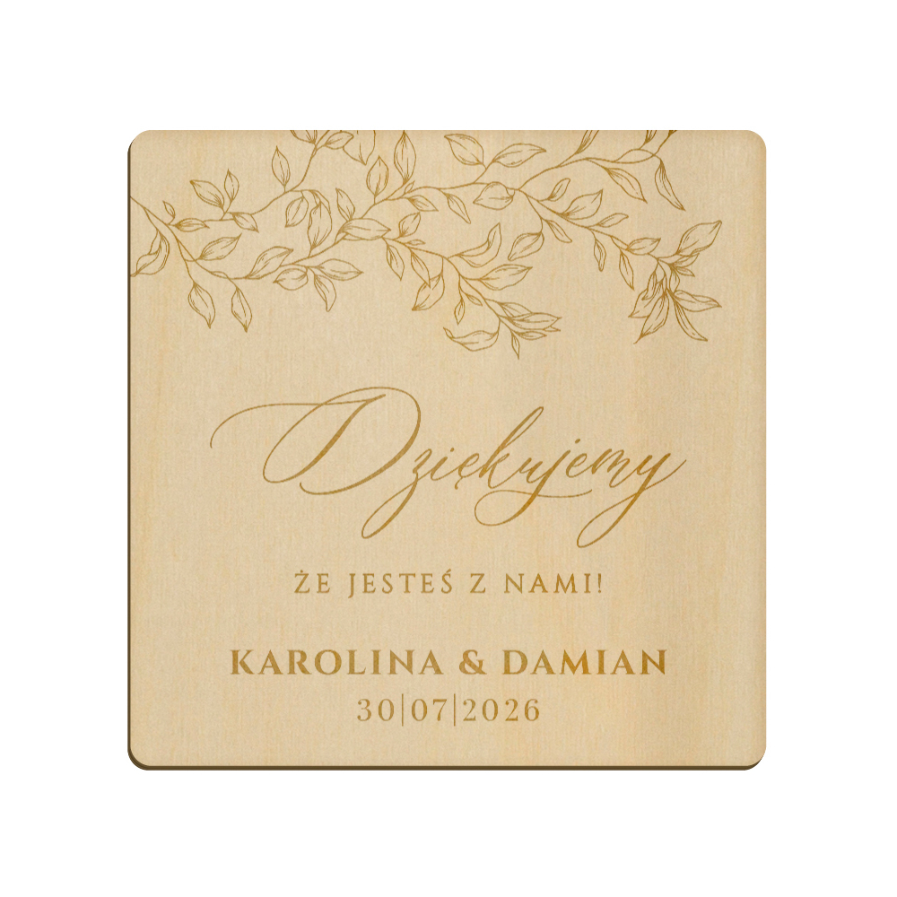 Drewniany magnes z grawerunkiem idealnie sprawdzi się w roli podziękowania dla gości weselnych.