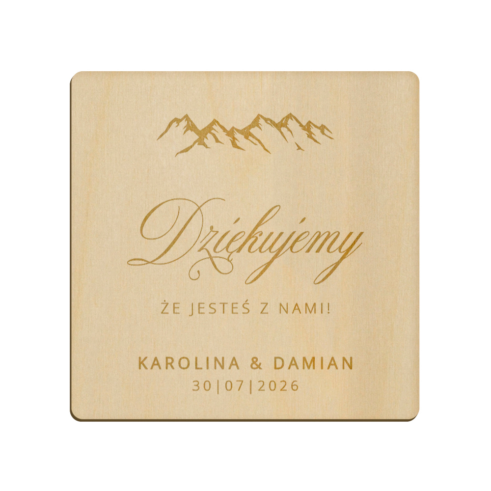 Drewniany magnes z grawerunkiem idealnie sprawdzi się w roli podziękowania dla gości weselnych.