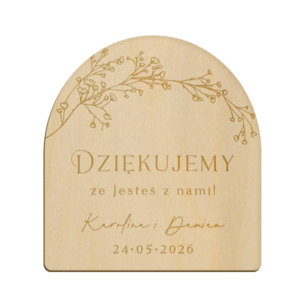 Drewniany magnes z grawerunkiem idealnie sprawdzi się w roli podziękowania dla gości weselnych.