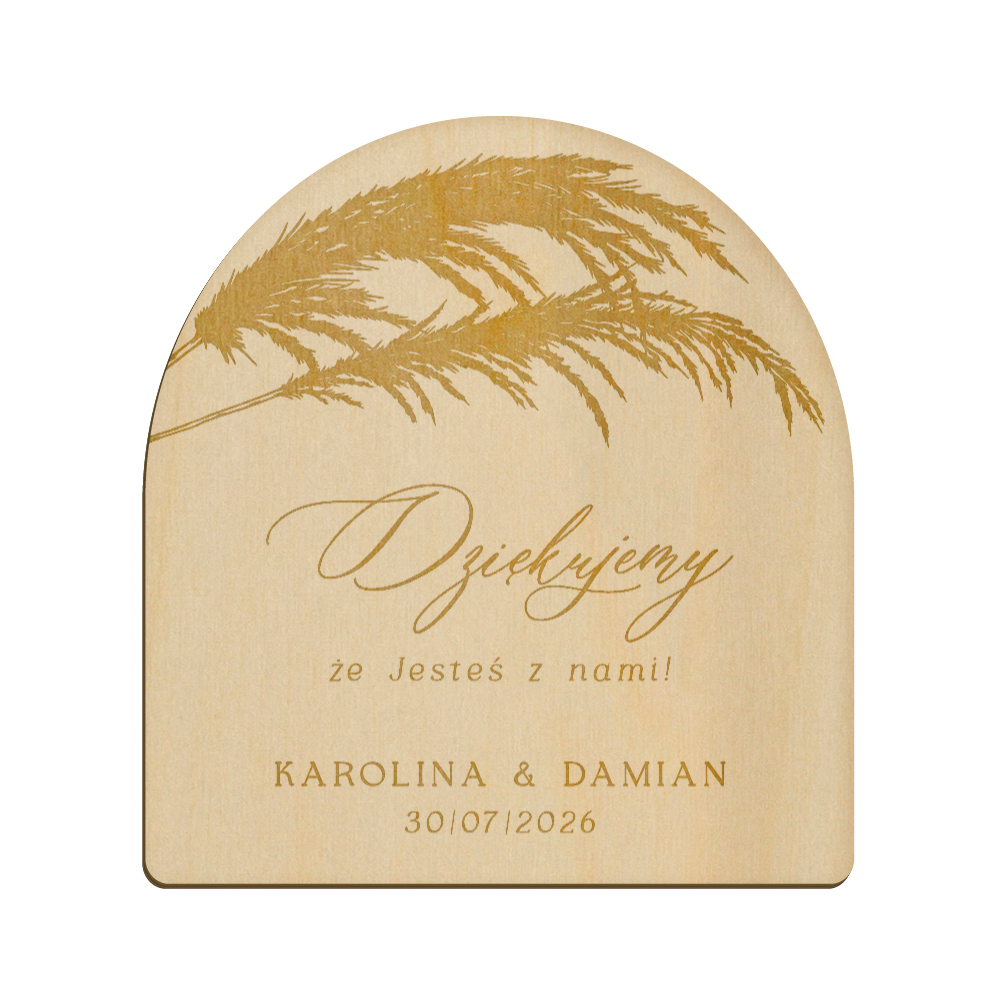 Drewniany magnes z grawerunkiem idealnie sprawdzi się w roli podziękowania dla gości weselnych.