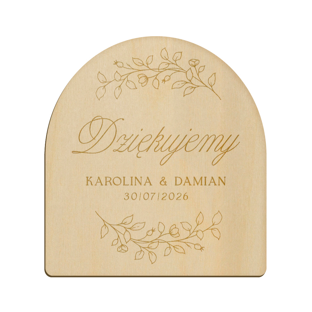 Drewniany magnes z grawerunkiem idealnie sprawdzi się w roli podziękowania dla gości weselnych.
