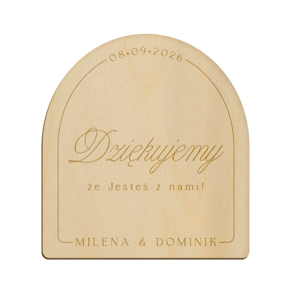 Drewniany magnes z grawerunkiem idealnie sprawdzi się w roli podziękowania dla gości weselnych.