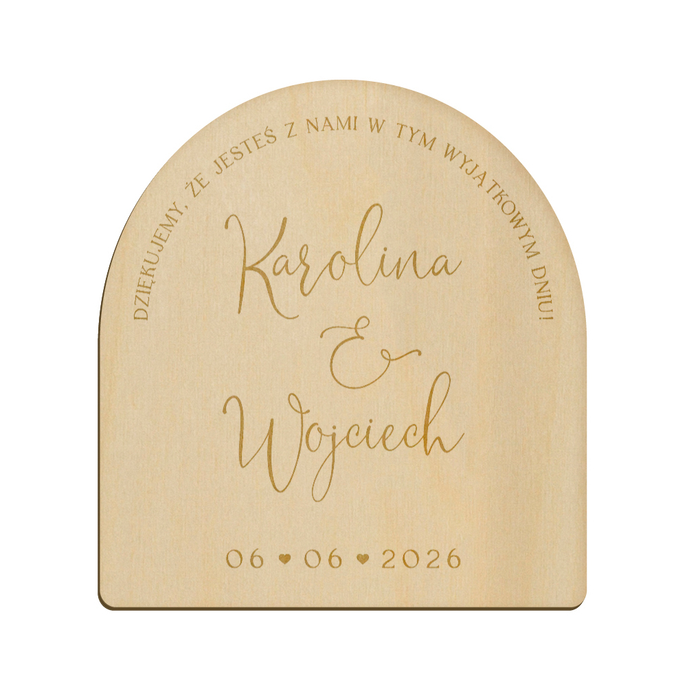 Drewniany magnes z grawerunkiem idealnie sprawdzi się w roli podziękowania dla gości weselnych.