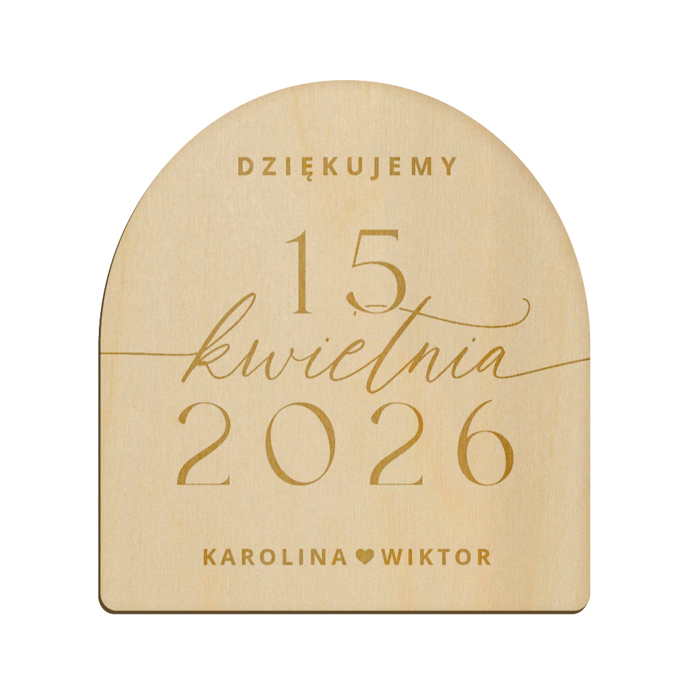 Drewniany magnes z grawerunkiem idealnie sprawdzi się w roli podziękowania dla gości weselnych.