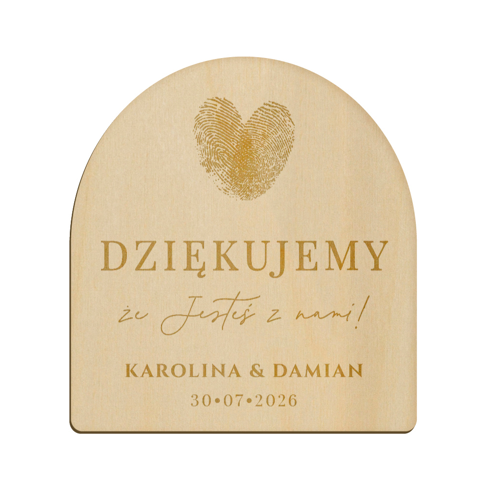 Drewniany magnes z grawerunkiem idealnie sprawdzi się w roli podziękowania dla gości weselnych.