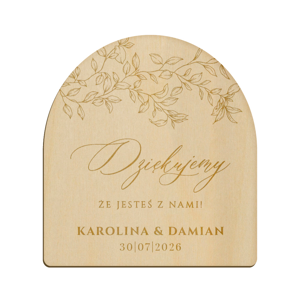 Drewniany magnes z grawerunkiem idealnie sprawdzi się w roli podziękowania dla gości weselnych.