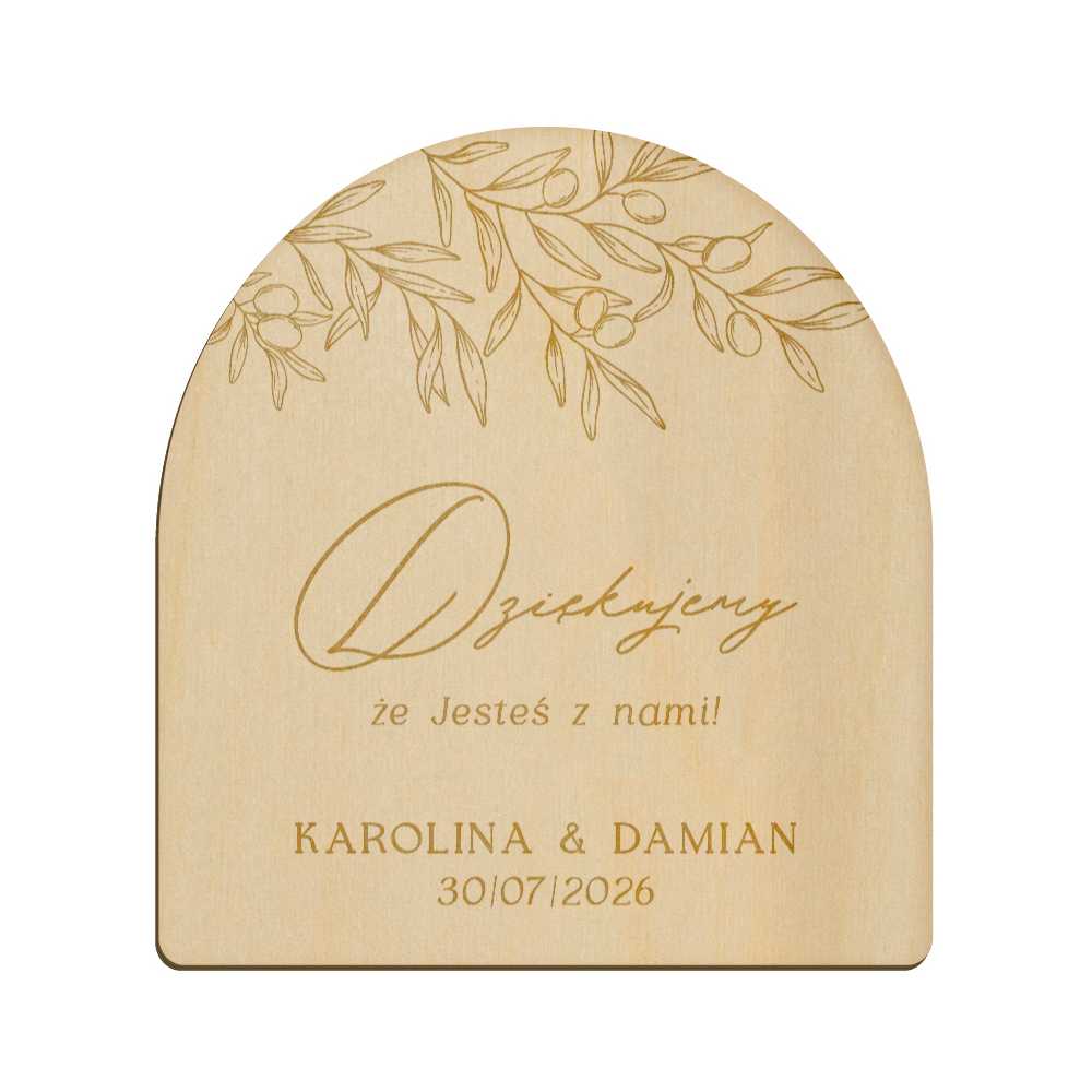 Drewniany magnes z grawerunkiem idealnie sprawdzi się w roli podziękowania dla gości weselnych.