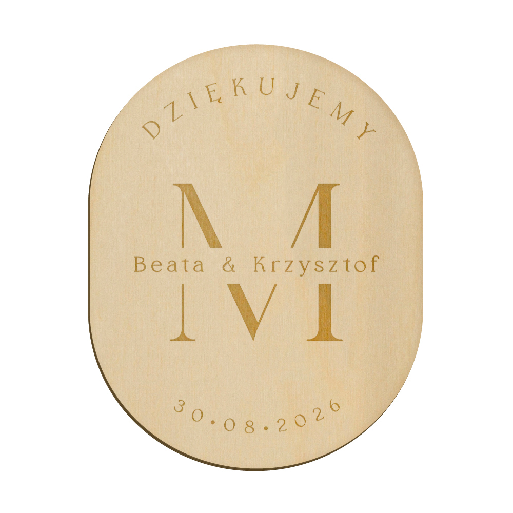 Drewniany magnes z grawerunkiem idealnie sprawdzi się w roli podziękowania dla gości weselnych.