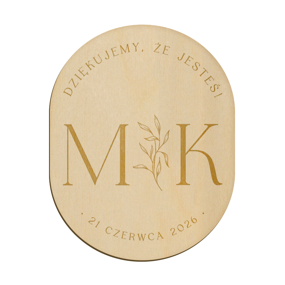 Drewniany magnes z grawerunkiem idealnie sprawdzi się w roli podziękowania dla gości weselnych.