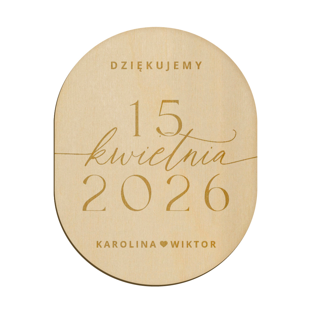 Drewniany magnes z grawerunkiem idealnie sprawdzi się w roli podziękowania dla gości weselnych.
