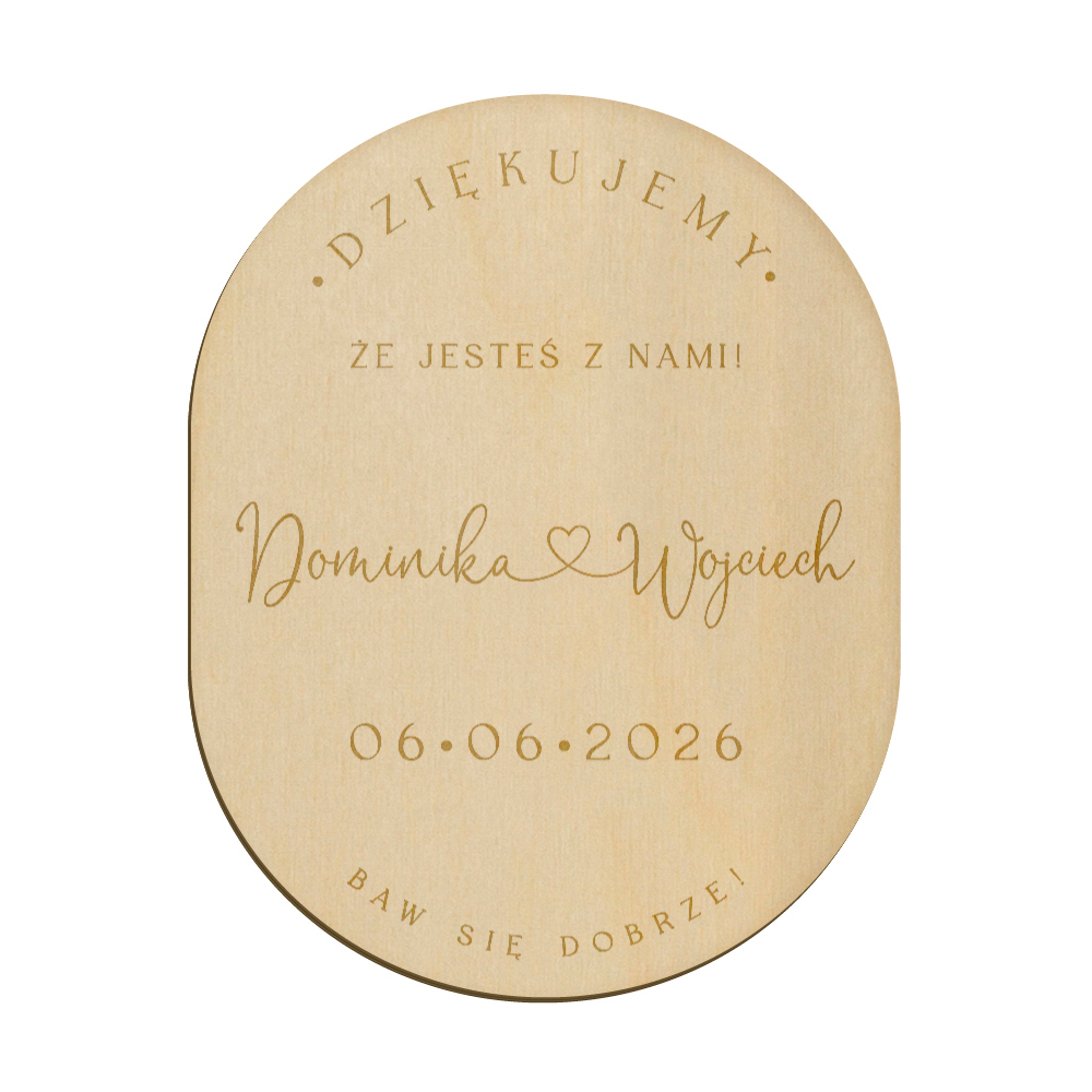 Drewniany magnes z grawerunkiem idealnie sprawdzi się w roli podziękowania dla gości weselnych.