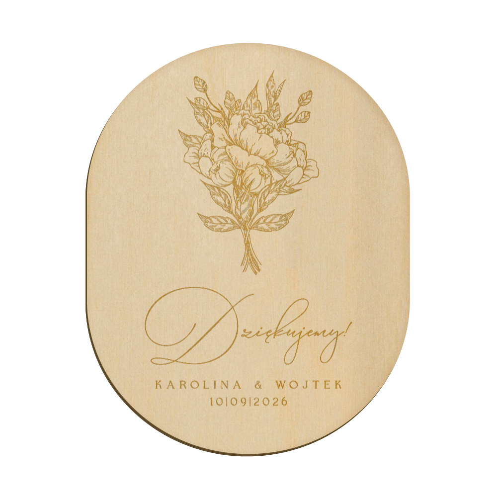 Drewniany magnes z grawerunkiem idealnie sprawdzi się w roli podziękowania dla gości weselnych.