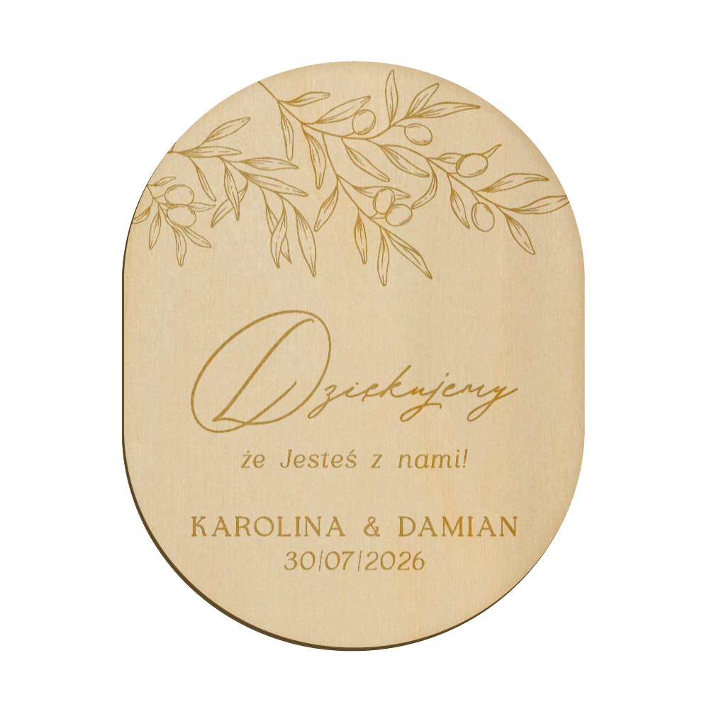 Drewniany magnes z grawerunkiem idealnie sprawdzi się w roli podziękowania dla gości weselnych.