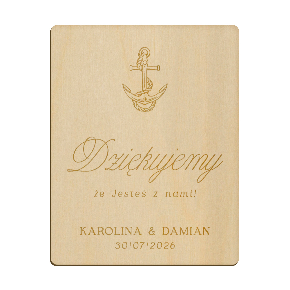 Drewniany magnes z grawerunkiem idealnie sprawdzi się w roli podziękowania dla gości weselnych.