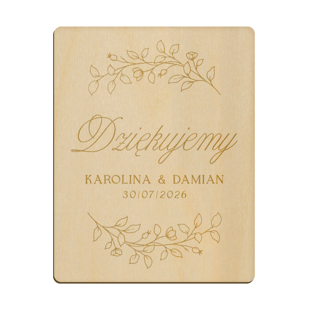 Drewniany magnes z grawerunkiem idealnie sprawdzi się w roli podziękowania dla gości weselnych.